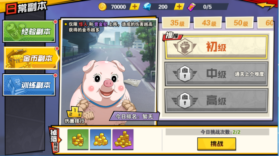 在“日常副本”入口中能找到“金币副本”挑战,每天有两次打猪人的机会,值得注意也容易被大家忽略的一个重点是,金币副本的挑战只能使用